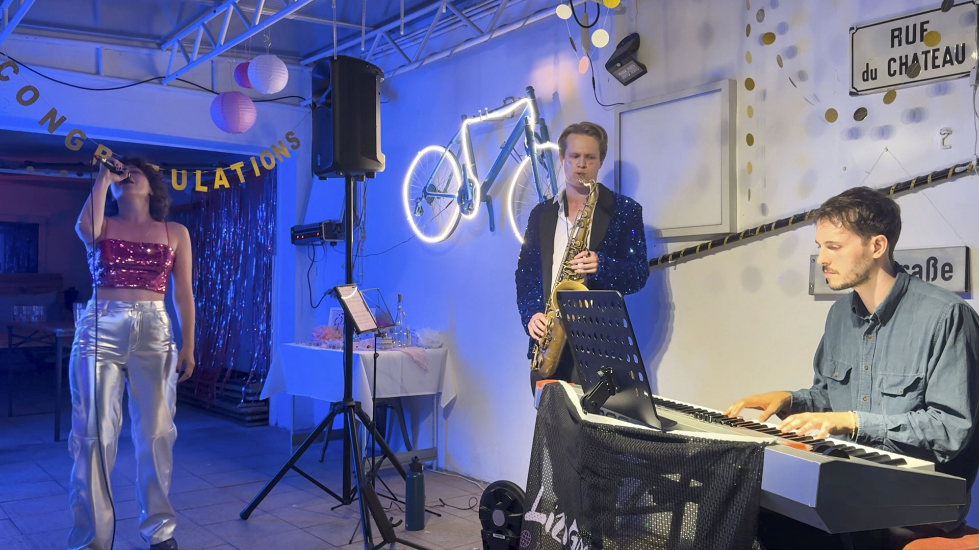 Wir spielen üblicherweise als Trio. Unsere Besetzung ist bewusst kompakt gehalten, damit wir flexibel bleiben: Wir passen Lautstärke, Setlänge und Songauswahl an jede Veranstaltung an – vom Sektempfang über Dinner-Begleitung bis zur anschließenden Party.